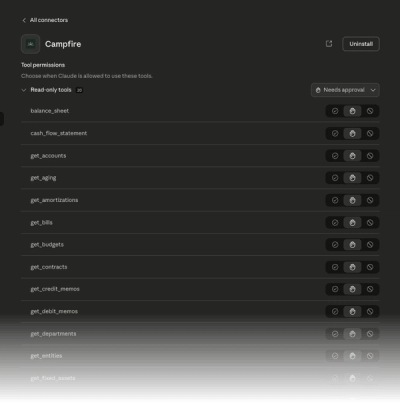 Campfire is now live on the Claude App Store. Connect your workspace with a single click and start querying your financial data directly inside Claude. Find us under Connectors in your Claude settings.