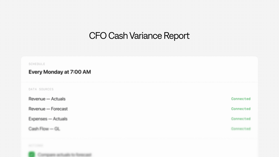 - Weekly CFO Cash Variance Report. Every Monday at 7am, Ember pulls your actuals, compares them to forecast, flags the variances, and emails a CFO-ready summary before anyone opens their laptop.
