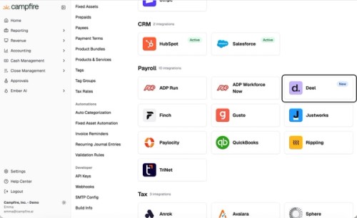 Deel is now available as a payroll connection in Campfire. Find it on the Connections page with a New badge. The connections page also got general improvements: alphabetical sorting, search fixes, a Cmd+F shortcut, and logos added for Deel, Okta, and Airwallex.