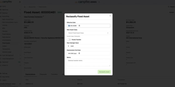 Moving a fixed asset between asset classes, for example from Construction-in-Progress to Leasehold Improvements, previously meant disposing and re-creating it, which broke the audit trail and accumulated depreciation history. A new Reclassify / Transfer action on the asset detail page handles catch-up depreciation, generates the correct reclassification journal entries, and supports partial transfers, all while preserving the full history.