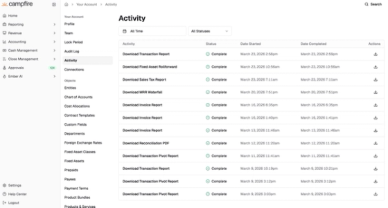 When you kick off a report export or bulk download, a new Activity page in Settings shows you the status, start time, and completion time of every async download in one place. Once a file is ready, grab it directly from the page.