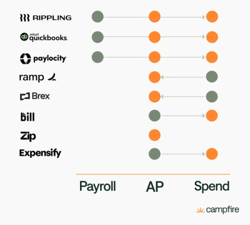 At Campfire, we’re seeing the lines blurring between categories of spend: Bills are more frequently being paid with corporate cards to maximize rewards (looking at you AWS bill), and contractor payments are often paid via either payroll providers and AP providers. Having unified software across all three categories provides for a more seamless experience when expenses shift across categories.