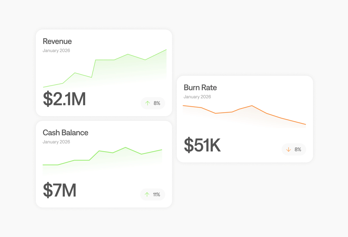 Budget vs. actuals, cash burn, project P&L: updated in real time, not at month-end.