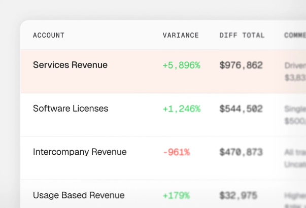 Ember automatically drafts flux variance commentary at close, pulling from your actual transaction data to explain what changed and why. Instead of spending hours building period-over-period comparisons in Excel, your team reviews and refines Ember's analysis, cutting reporting time significantly and giving executives the narrative context they need alongside the numbers.