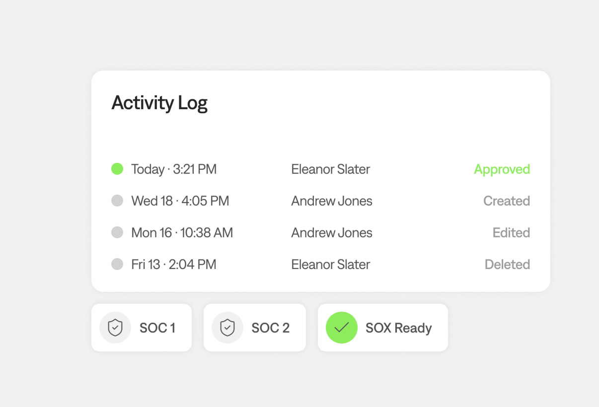 Yes. Campfire is fully ASC 606 compliant, with automated revenue schedules, contract-level audit trails, and deferred revenue tracking built in. It's also SOC 1 & 2 Type 1 & 2 certified with granular permissioning designed to support SOX-readiness for companies preparing for IPO or operating in public markets.