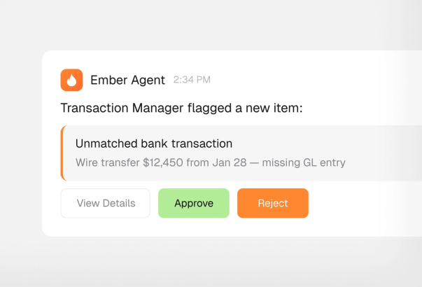 Every Ember output includes full source attribution. You can see exactly which transactions, accounts, or documents informed the answer or journal entry. This is a deliberate design choice: finance teams and auditors need to verify AI decisions, not just trust them. Ember's human-in-the-loop approach means your team stays in control while eliminating the manual work.