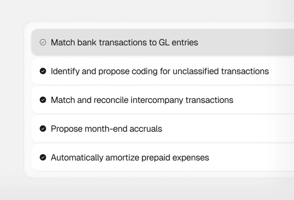 Matches bank transactions to GL entries, including multi-currency and variance handling. Identifies uncategorized transactions and proposes accounts, departments, vendors, and custom dimensions. Reconciles intercompany transactions across entities. You approve what needs it.